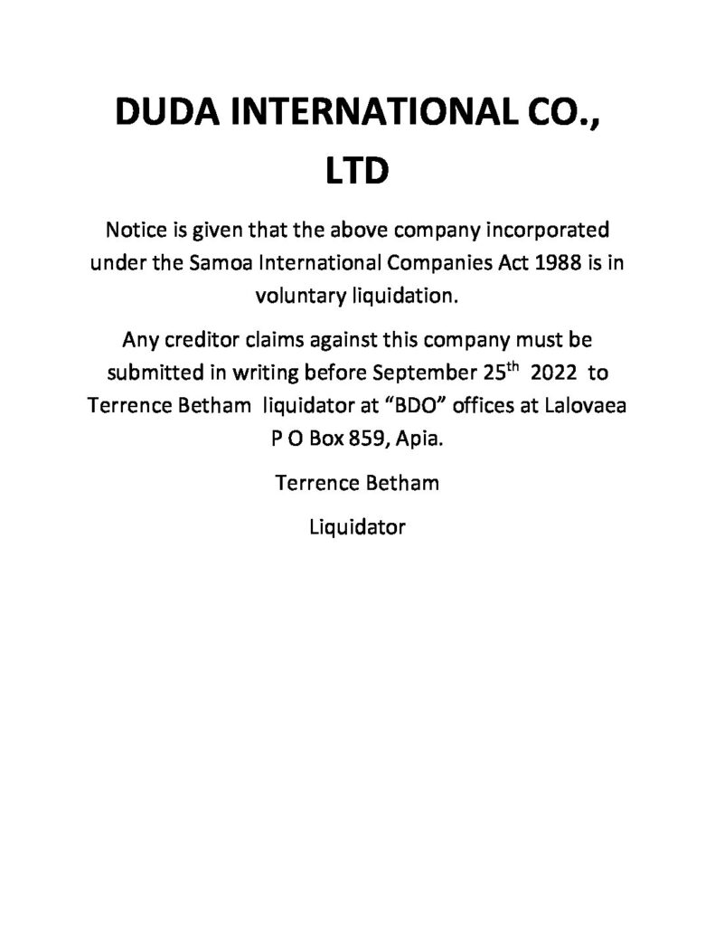 Share this: Share on Facebook (Opens in new window) Facebook Share on X (Opens in new window) X Related Share via: Facebook Twitter LinkedIn More Related posts: UN Job Opportunity SamoaTourism Authority Post navigation NOTICE COURT AUCTION LIQUIDATION NOTICE