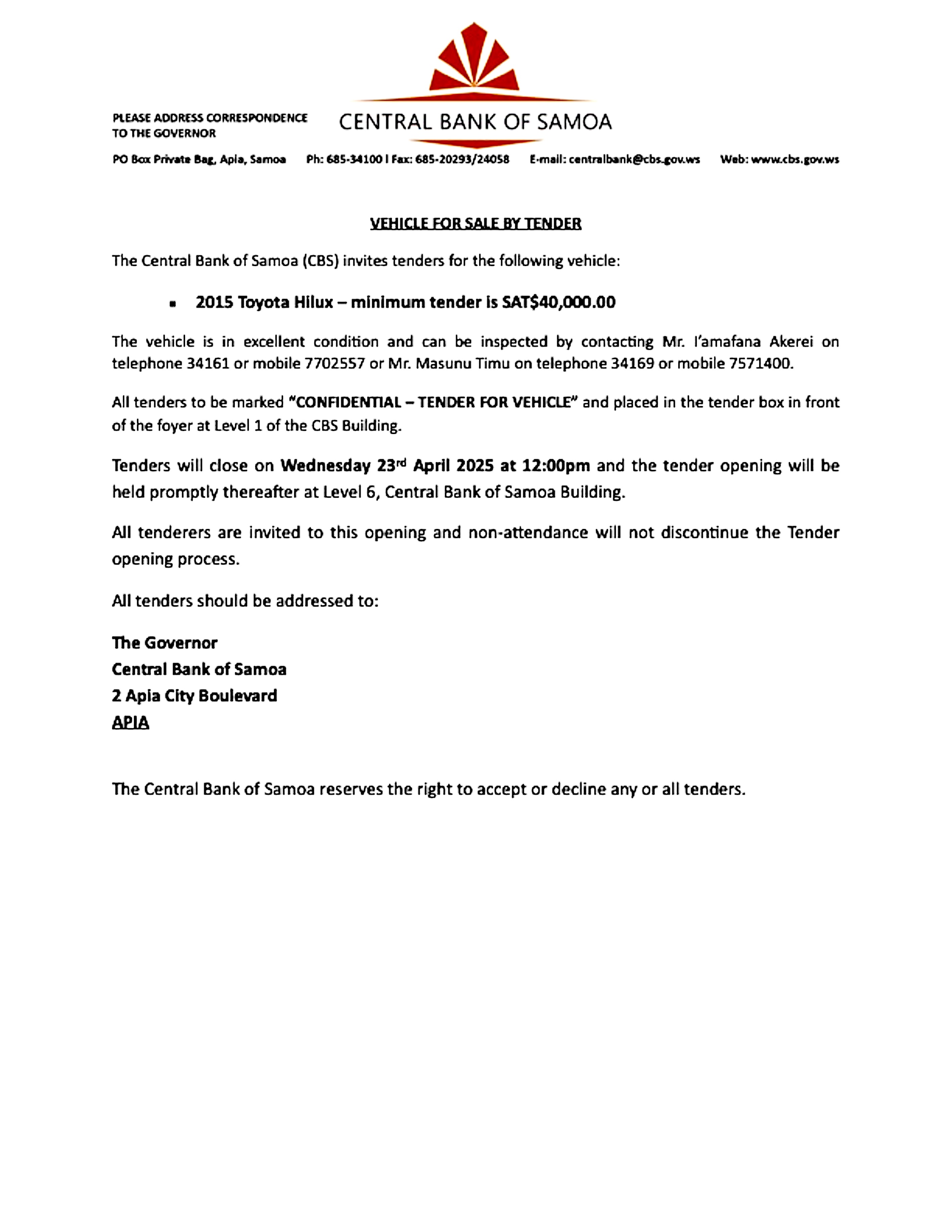 Share this: Share on Facebook (Opens in new window) Facebook Share on X (Opens in new window) X Related Share via: Facebook Twitter LinkedIn More Related posts: DBS SPECIAL ADVERTISEMENT SPA Vehicle Tender Sale Samoa Shipping Corporation Vacancy Advertisement. JOB VACANCIES – FOOTBALL FEDERATION SAMOA Post navigation New Logo Identity For Regulator’s Office Tokelau Coral Reef Recovery Among Conservation Expedition Findings