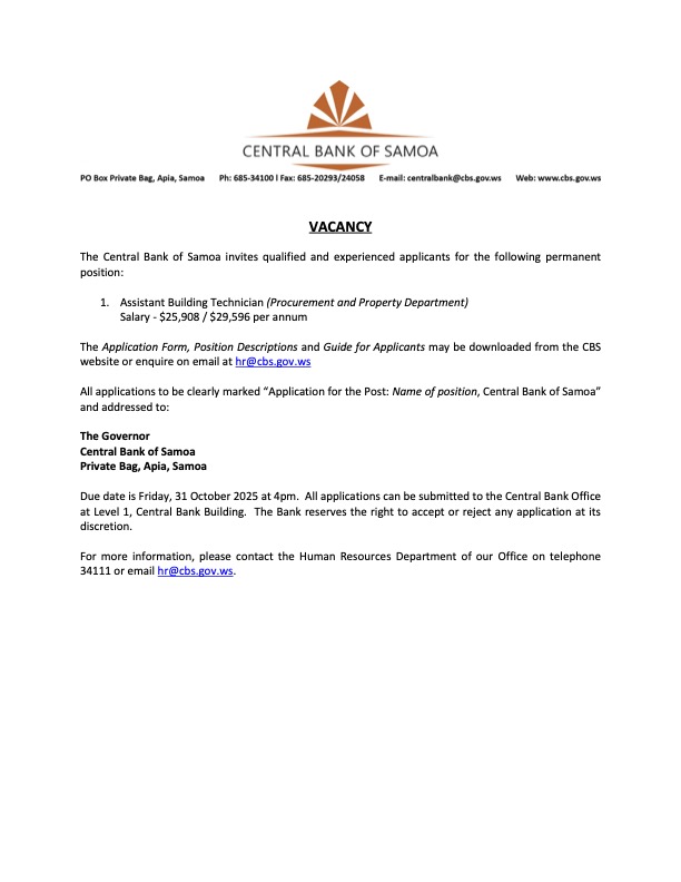 Share this: Share on Facebook (Opens in new window) Facebook Share on X (Opens in new window) X Related Share via: Facebook Twitter LinkedIn More Related posts: PUBLIC TRUST OFFICE VACANCY PIYO PIYO (SAMOA) INTERNATIONAL CO. LTD LAND SALE BY AUCTION – VAIUSU HAPPY MOTHER’S DAY WISH – LTA Post navigation BSP Ratesheet 16.10.25 Samoa Housing Corporation: Sale of Freehold Property – Afiamalu (Lot 21 & 23 Plan 12189)