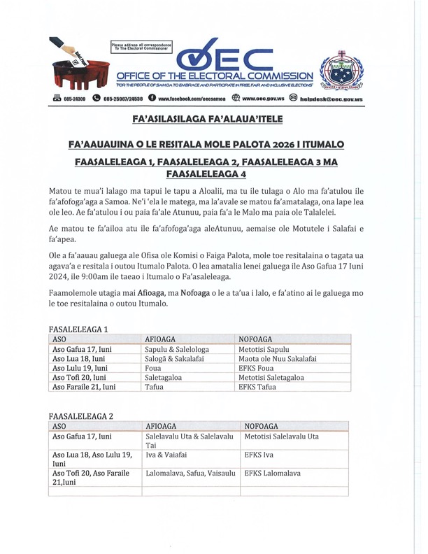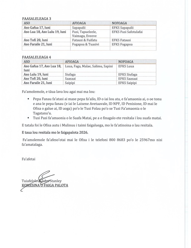 Share this: Share on Facebook (Opens in new window) Facebook Share on X (Opens in new window) X Related Share via: Facebook Twitter LinkedIn More Related posts: Samoa Shipping Corporation Vacancy Advertisement. JOB VACANCIES – FOOTBALL FEDERATION SAMOA CBS Request For Proposals FOTU SAMOA II TRIP APIA-PAGO PAGO Post navigation Wife Of PNG Gov. General Bestowed Peseta Chiefly Title Sale Of Freehold Land – Vaivase-uta