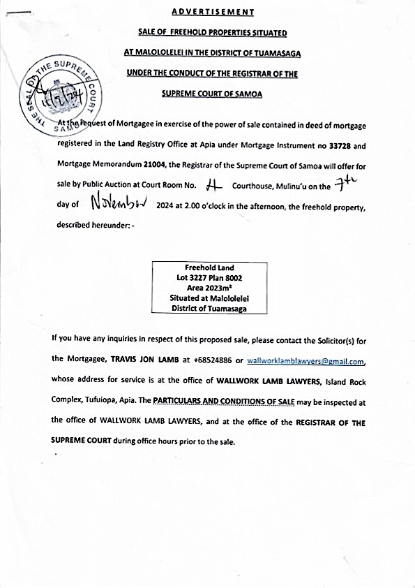 Share this: Share on Facebook (Opens in new window) Facebook Share on X (Opens in new window) X Related Share via: Facebook Twitter LinkedIn More Related posts: JOB VACANCY : FINANCE ASSISTANT EATHU CASTING AND FORGING CO., LTD DBS SPECIAL ADVERTISEMENT SPA Vehicle Tender Sale Post navigation Samoa at the Ironman World Champs FREEHOLD LAND SALE – MALOLOLELEI & LETAVA