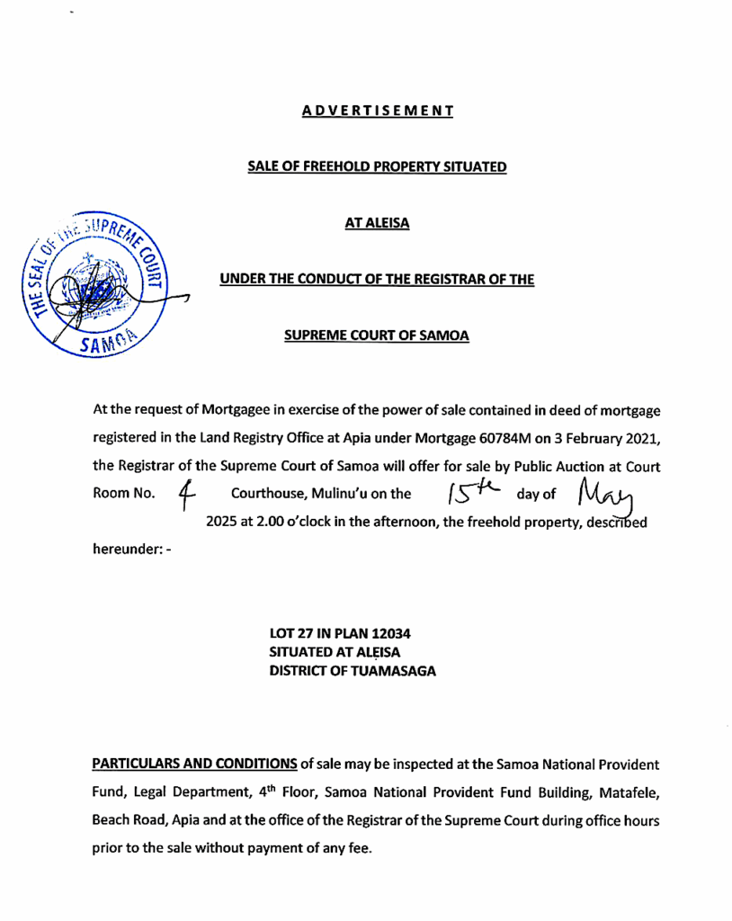 Share this: Share on Facebook (Opens in new window) Facebook Share on X (Opens in new window) X Related Share via: Facebook Twitter LinkedIn More Related posts: Students Prefer Classroom Learning EASTER MESSAGE – SAMOA SHIPPING CORP. MOF NOTICE – FUEL FACILITTY Komesina Faiga Palota – Fa’asilasilaga Fa’alaua’itele Post navigation Freehold Property Sale – Afiamalu Public Auction – Aleisa
