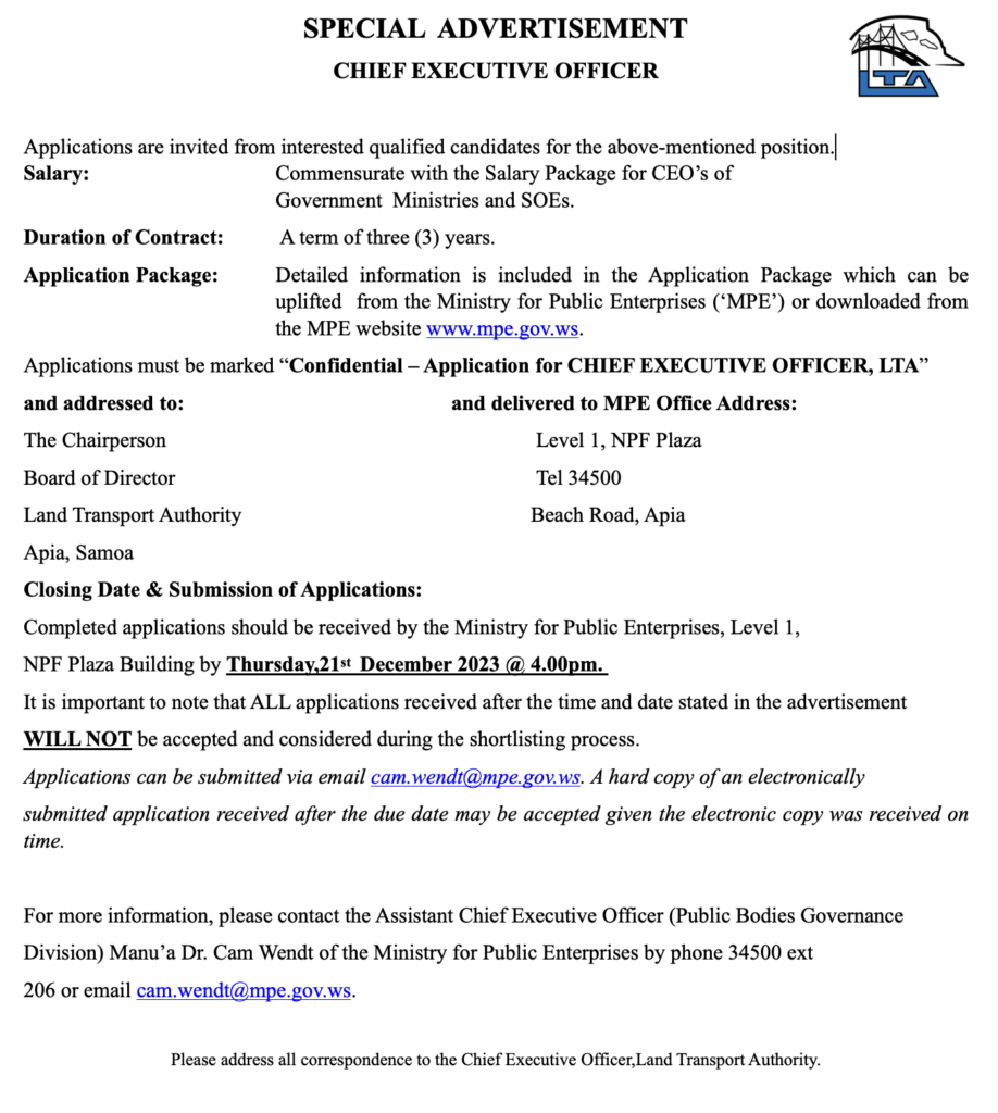 Share this: Share on Facebook (Opens in new window) Facebook Share on X (Opens in new window) X Related Share via: Facebook Twitter LinkedIn More Related posts: Samoa Shipping Corporation Vacancy Advertisement. OEC- PUBLIC NOTICE JOB VACANCIES – FOOTBALL FEDERATION SAMOA CBS Request For Proposals Post navigation Minister of Finance, Hon. Lautimuia Afoa Uelese Vaai – Keynote address Women Sailors Win Bronze In Pacific Games
