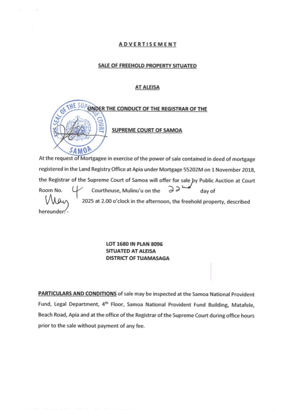 Share this: Share on Facebook (Opens in new window) Facebook Share on X (Opens in new window) X Related Share via: Facebook Twitter LinkedIn More Related posts: TENDER OF SPA VEHICLES CBS MONETARY POLICY DECISION FOR FY2023/24 BSP Samoa – System Maintenance Notice Post navigation FREEHOLD PROPERTY SALE – NU’U OPINION : Great minds, average minds and small minds
