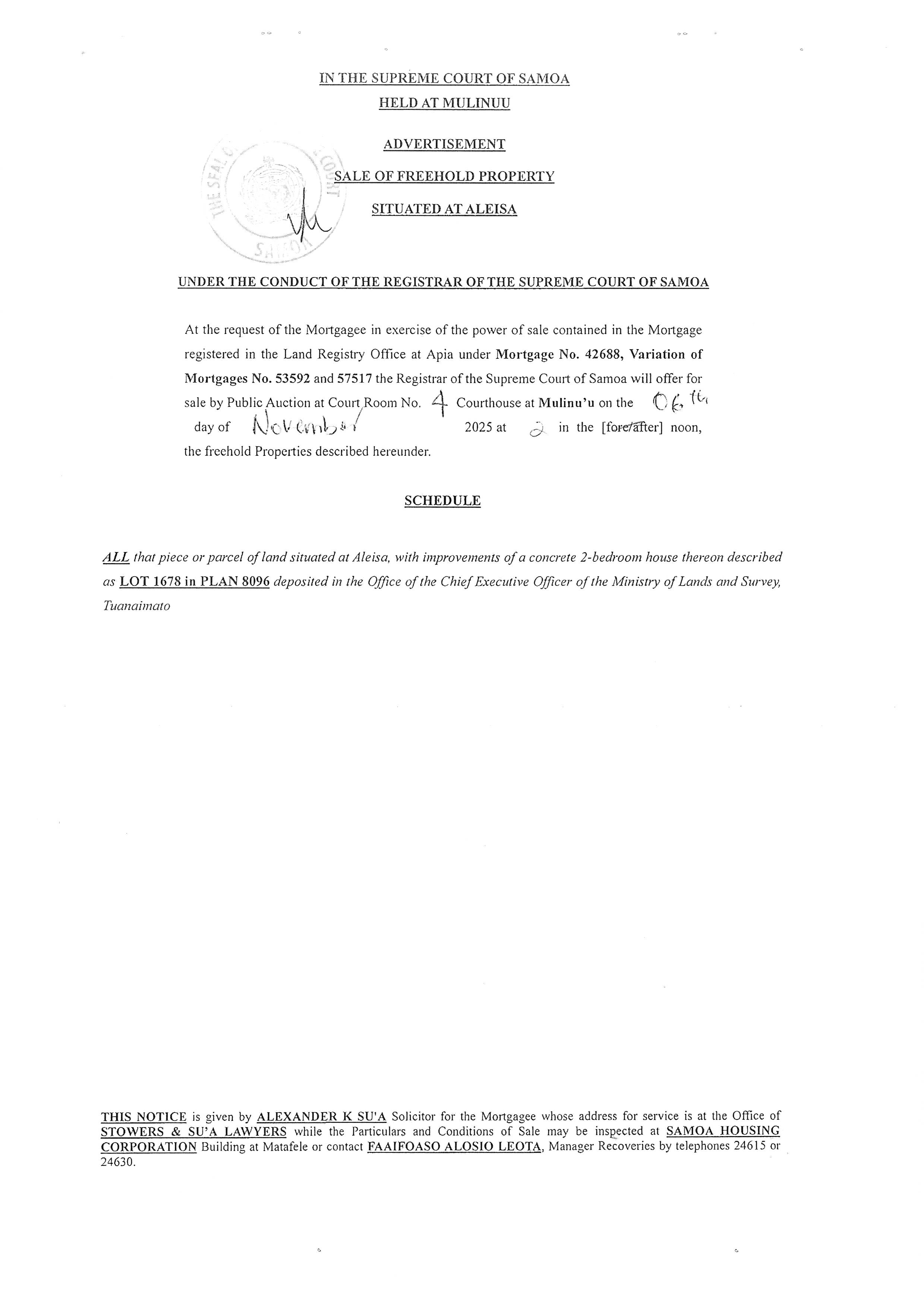 Share this: Share on Facebook (Opens in new window) Facebook Share on X (Opens in new window) X Related Share via: Facebook Twitter LinkedIn More Related posts: JOB VACANCY : FINANCE ASSISTANT EATHU CASTING AND FORGING CO., LTD PUBLIC TRUST OFFICE VACANCY PIYO PIYO (SAMOA) INTERNATIONAL CO. LTD Post navigation Public Liquidation notice -TRITAN TECHNOLOGY INC. Samoa Housing Corporation: Sale of Freehold Property – Samatau (Lot 652 Plan 5461)