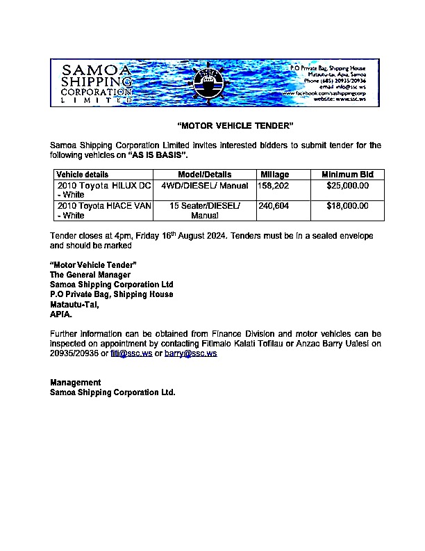 Share this: Share on Facebook (Opens in new window) Facebook Share on X (Opens in new window) X Related Share via: Facebook Twitter LinkedIn More Related posts: JOB VACANCY : FINANCE ASSISTANT EATHU CASTING AND FORGING CO., LTD DBS SPECIAL ADVERTISEMENT SPA Vehicle Tender Sale Post navigation Samoa attends the Inaugural Pacific Banking Forum in Brisbane, Australia BSP Sponsors Samoa Uniforms for the Touch World Cup 2024