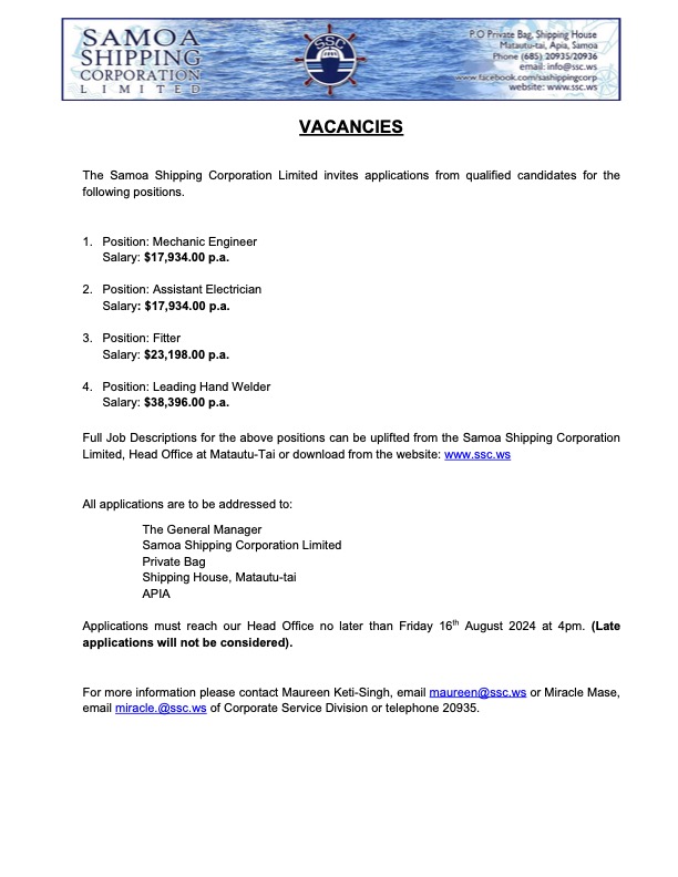 Share this: Share on Facebook (Opens in new window) Facebook Share on X (Opens in new window) X Related Share via: Facebook Twitter LinkedIn More Related posts: JOB VACANCY : FINANCE ASSISTANT EATHU CASTING AND FORGING CO., LTD DBS SPECIAL ADVERTISEMENT Post navigation Komesina Faigapalota – Fa’asilasilaga Fa’alua’itele CBS Public Notice