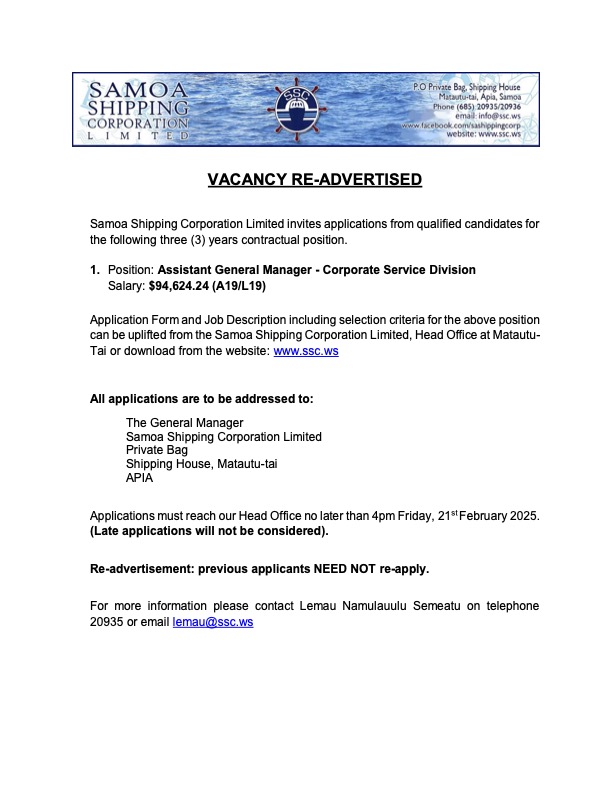 Share this: Share on Facebook (Opens in new window) Facebook Share on X (Opens in new window) X Related Share via: Facebook Twitter LinkedIn More Related posts: JOB VACANCY : FINANCE ASSISTANT EATHU CASTING AND FORGING CO., LTD DBS SPECIAL ADVERTISEMENT SPA Vehicle Tender Sale Post navigation First French Ambassador Based In Samoa Takes Up Duties Culture Maybe Decisive In Miss Samoa Winning Chances